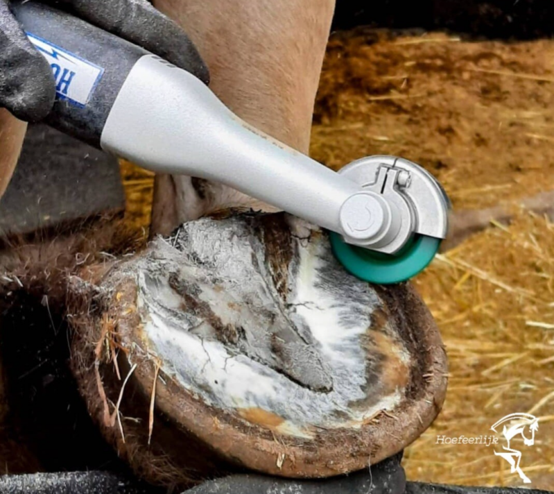 Als het paard het toelaat werk ik graag machinaal. Dit doe ik met de Hoofboss. Met het machinaal bekappen kun je de hoef heel precies bijwerken zonder dat er veel kracht voor nodig is. Mijn eigen ervaring is dat paarden het als erg prettig ervaren. Ik leg u als eigenaar graag uit hoe het werkt en ik laat het paard er rustig aan wennen. Ik zal hem eerst een keer aan doen om te kijken hoe het paard er op reageert. Pas als ik vind dat het paard er goed op reageert beginnen we met bekappen. Het kan voorkomen dat een paard het echt heel eng vind. Dan gebruiken we hem niet en werk ik met de mesjes. Gelukkig komt dat niet vaak voor en vinden veel paarden het prettig!